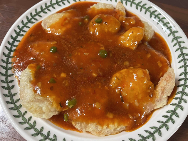 아내 분은 소스가 조금 덜 묻은 새우로 먹어보았습니다. 큼직한 새우의 통통한 살이 쫀득하고 바삭한 튀김옷에 입혀져서 새콤달콤한 소스와 너무 잘 어울리고 적당한 매콤한 맛이 괜찮았습니다.