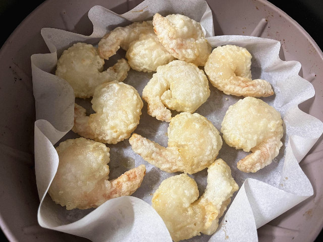 먼저 냉동새우를 에어프라이어에서 190℃에서 약 8~10분간 조리합니다.