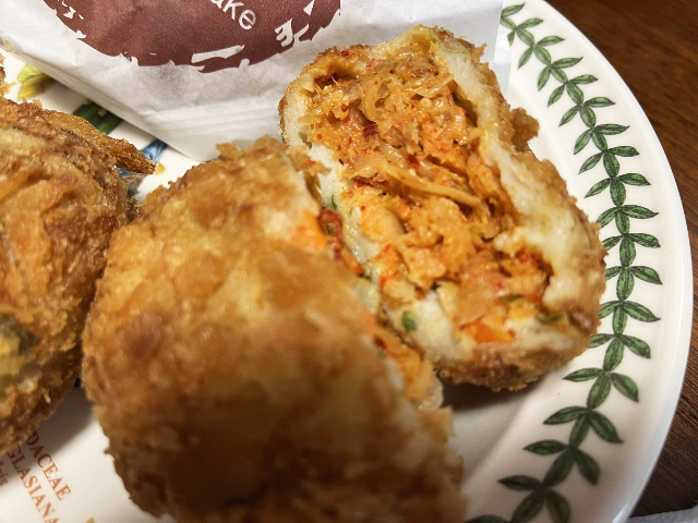 김치 어묵고로케입니다. 김치만두와 비슷한 느낌입니다. 김치의 매콤한 맛이 생각보다 진해서 어묵의 단맛은 조금 감춰지지만 느끼함을 달래줄 수 있는 맛으로 잘 어울리는 조합이었습니다.