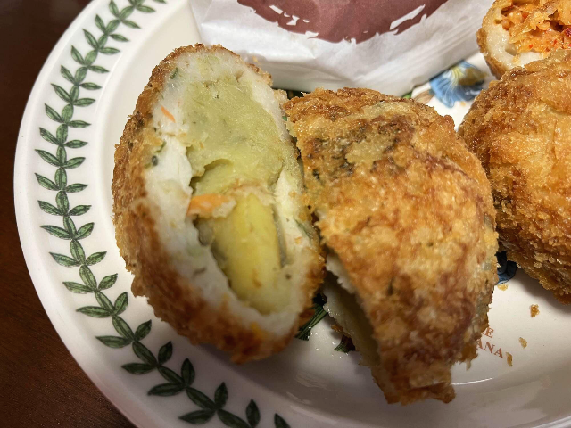 먼저 고구마 어묵고로케입니다. 반을 잘라보니 고구마무스가 가득 들어있습니다. 쫀득쫀득하고 감칠맛이 도는 어묵 위로 바삭한 고로케의 식감이 생각보다 너무나 잘 어울리고 맛있었습니다. 고구마무스의 맛도 단맛이 잘 어울리고 단맛 좋아하는 분이라면 누구나 좋아할 것 같은 맛이었습니다.