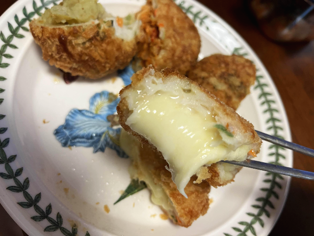 마지막으로 치즈 어묵고로케입니다. 연돈돈가스처럼 치즈가 가득 들어있습니다. 먹기 전에는 느끼하지 않을까 생각했는데요. 막상 먹어보니 치즈의 고소함이 치즈돈가스 먹는 것처럼 쫀득쫀득 고소한 맛의 끝이었습니다.