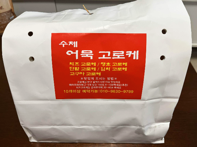 포장백에 어묵고로케를 맛있게 드시는 방법이 나와있습니다. 고로케를 바로 먹으면 가장 맛있겠지만 에어프라이어에서 160도 8~10분 데워주시면 됩니다. 치즈고로케는 에어프라이어가 아닌 전자렌지로 30~40초라고 하네요.