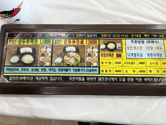 메뉴는 순두부백반과 순두부전골 두가지입니다. 이전 방문 때와 다르게 바뀐 듯했습니다. 순두부백반은 1인 주문 가능하고 순두부전골은 2인 이상 주문 가능합니다. 저희는 담백한 두부를 먹기 위해 순두부백반으로 주문하였습니다.