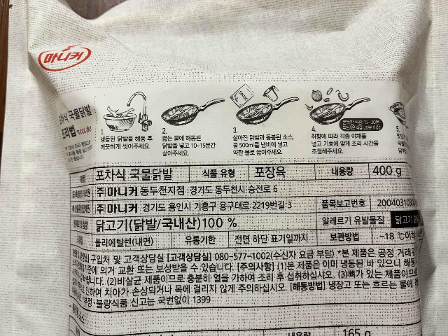 포차식 국물닭발 조리법 - 1. 냉동된 닭발을 해동 후 깨끗하게 씻어주세요 2. 끓는 물에 해동된 닭발을 넣고 10~15분간 삶아주세요 3. 삶아진 닭발과 동봉된 소스를 500ml를 냄비에 넣고 약한 불로 끓여주세요 4. 취향에 따라 각종 야채를 넣고 기호에 맞게 조리 시간을 조절해주세요 쫀득한 식감 : 15~20분 부드러운 식감 20분 이상 5. 맛있게 조리된 닭발을 접시에 담아냅니다