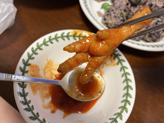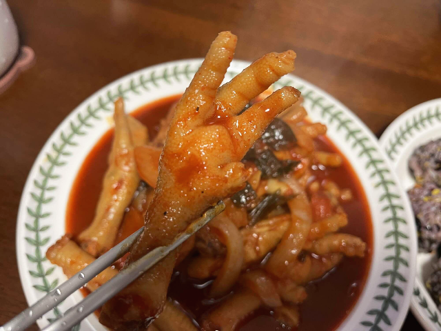 국물닭발을 먹어보았습니다. 매콤하면서 달달한 소스가 닭발과 잘 어우러졌습니다. 뼈 마디마디를 잘라가면서 살을 발라 먹는 닭발의 재미는 많지 않지만 그 살을 입에 가득 담을 때 닭발의 맛이 가장 좋은 것 같습니다. 뼈를 발라먹기 귀찮은 분들은 무뼈닭발도 많이 선호하는데요. 그냥 닭발은 무뼈닭발과 식감의 차이가 있어서 저는 뼈있는 닭발을 선호하는 편입니다.