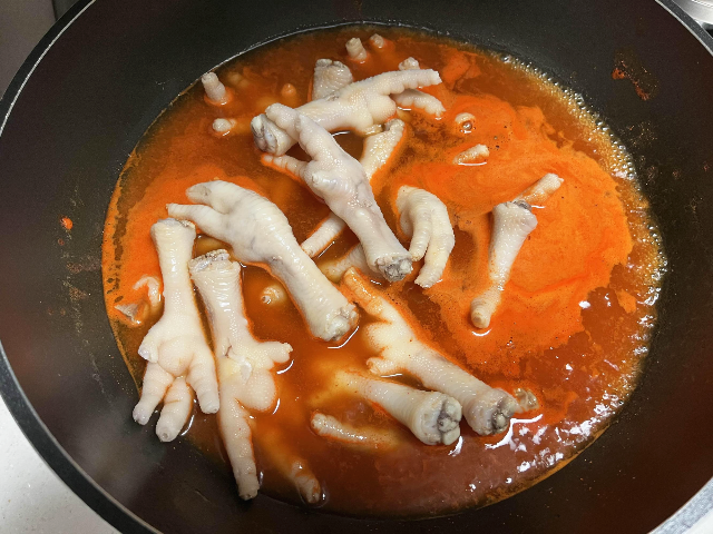 타지않게 불 조절을 해가며 15~20분 정도는 쫀득한 식감의 닭발이고 20분 이상은 부드러운 닭발이 완성됩니다. 저는 시간보다 국물이 적당히 졸여지고 닭발에 양념이 잘 베어날 수 있도록 눈으로 보면서 조리하였습니다.