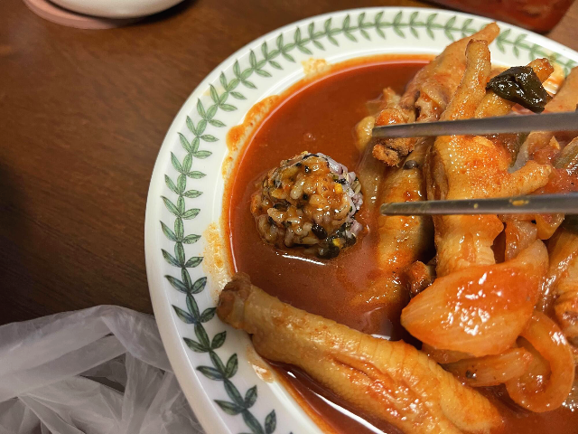 닭발의 매운맛이 올라올 때 주먹밥을 국물에 살짝 찍어서 먹어봅니다.