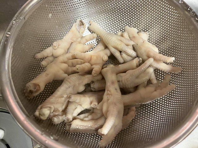15분 정도 삶은 닭발을 찬물에 한번 헹궈주었습니다. 매끈하고 뽀얀 닭발이 되었습니다.