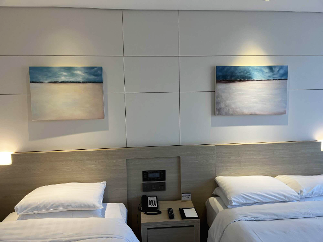 더본호텔의 디럭스 트리플룸의 첫인상은 깔끔하고 포근한 느낌이 들었습니다. 싱글침대와 더블침대가 놓여있고 머리 위에 있는 액자와 조명들이 따뜻한 느낌이 들어서 좋았습니다.
