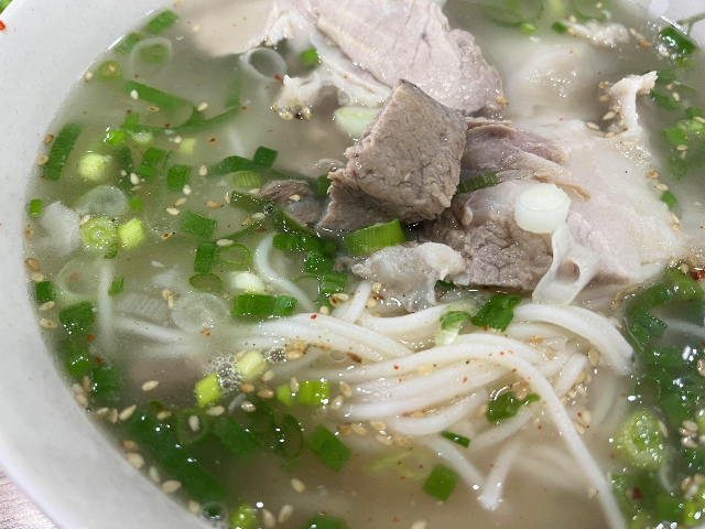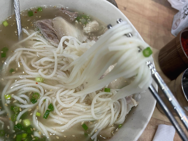 국물부터 먹어보았습니다. 고소하고 진한 국물부터 맛있었습니다. 먹는 순간 아 이곳이 왜 사람이 많고 유명한지 한번에 느낄 수 있었습니다. 고기도 부드럽고 굉장히 담백해서 비계까지도 느끼하지 않고 정말 맛있었습니다. 고기 양도 많아서 국수지만 적당히 배부르게 먹을 수 있던 것 같습니다.