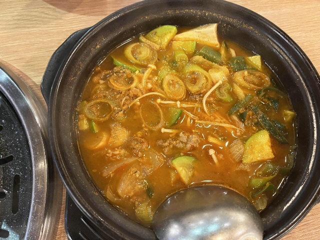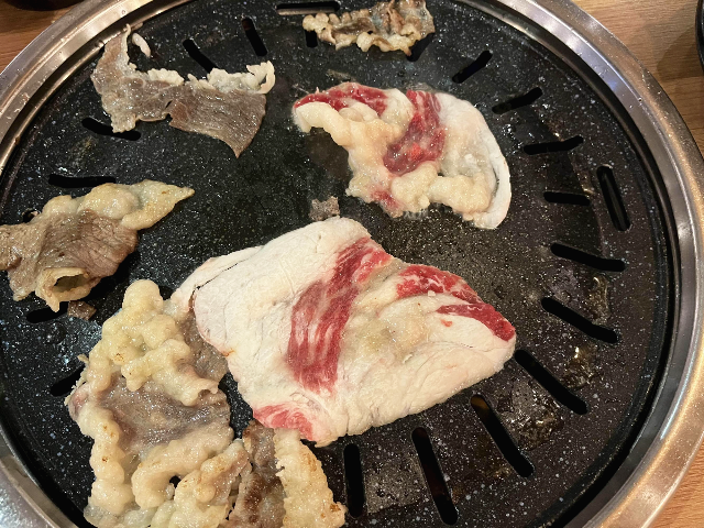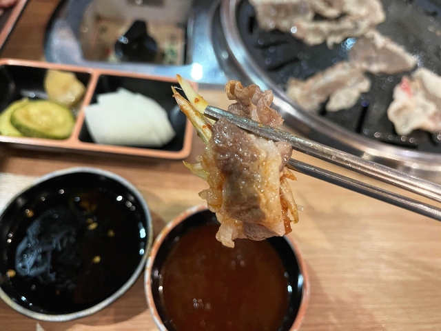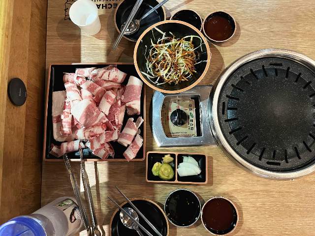 잘 구워진 차돌박이를 먹어보았습니다. 첫인상과는 다르게 고기는 맛있었습니다. 고기를 찍어먹는 소스가 달달하면서 매콤한 맛이 좋았는데요. 같이 나온 파절임의 소스도 맛있어서 파절임과 함께 먹으니 더욱 맛있었습니다.