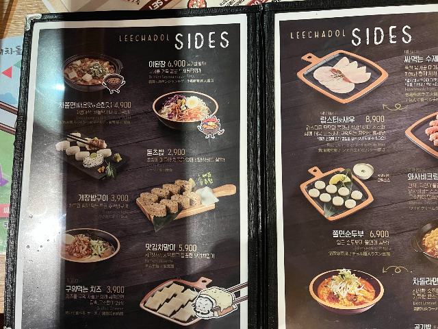이차돌의 메뉴판입니다. 런치세트가 있고 디너세트가 있습니다. 아내 분과 둘이서 먹기에 커플세트(2인)으로 주문하려고 했는데 아내 분은 쫄면과 치즈는 먹고 싶지 않다고해서 세트는 포기하였습니다.