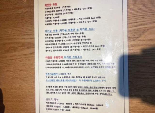 미와쿠우동에 메뉴판입니다. 그림이나 사진이 없이 알수없는 이름들의 우동에 순간 다들 당황하였습니다. 친절히 설명도 쓰여있었지만 처음 접하는 우동의 세계에 조금 놀랐습니다. 처음 방문이니 저는 기본에 가까운 규니쿠우동(소고기우동)으로 주문하였습니다.