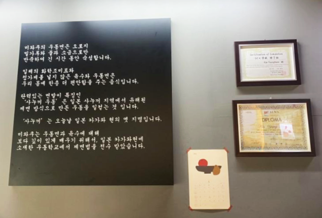 자가제면 우동집이라서 시간이 조금 걸린다고 말씀하셨습니다. 기다리는 동안에 메뉴판도 다시한번 읽어보기도 하고 가게를 둘러보니 약간의 설명과 자격증 아님 상장 같이 보이는 것들이 벽에 붙어 있었습니다. 미와쿠의 우동면은 오로지 밀가루와 물과 소금으로만 반죽하여 숙성한다고 합니다. 일체의 화학조미료와 첨가제를 넣지 않은 육수와 우동면으로 몸에 편안함을 주는 음식이라고 합니다.