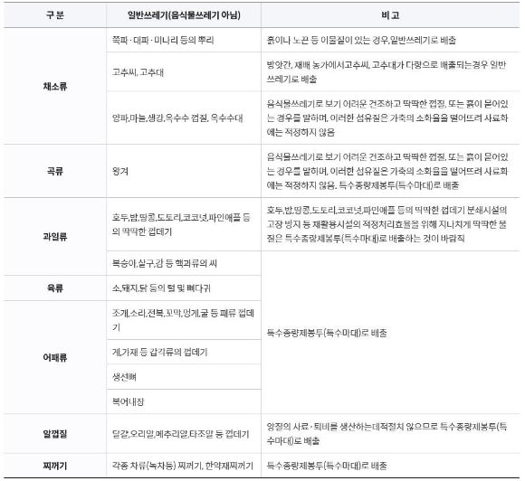 위와 같이 생선 뼈, 소, 돼지, 닭 등의 뼈나 털, 조개, 복숭아 씨앗, 감 씨앗, 계란 껍데기 등은 일반쓰레기이며 바나나, 사과 등과 같이 껍질이 부드러운 과일의 껍질은 음식물쓰레기입니다. 동물이 섭취가 가능한지에 따라 달라지며 동물이 섭취가 가능하다면 음식물쓰레기이고 섭취가 불가능하다면 일반쓰레기입니다.