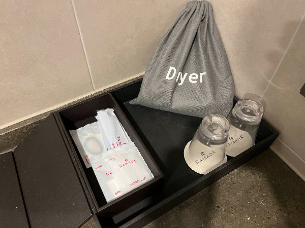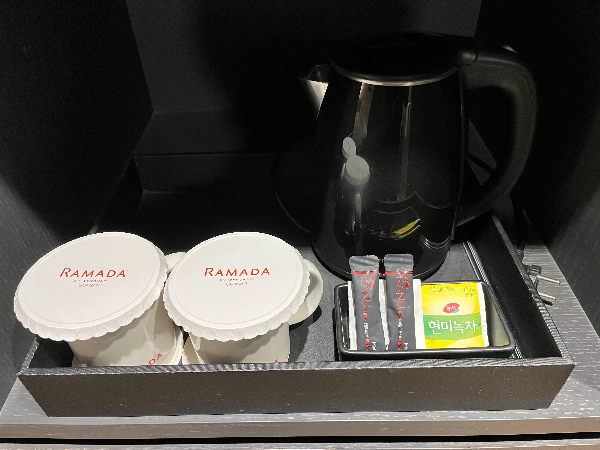 기본적인 어메니티와 일회용품들도 구비되어 있습니다. 코로나 때문에 없는 숙소도 있었던 것 같은데 라마다호텔은 다행히 있어서 좋았습니다.