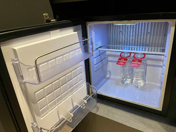 커피포트와 커피, 녹차 그리고 작은 냉장고에 생수 2병도 마련되어 있습니다.