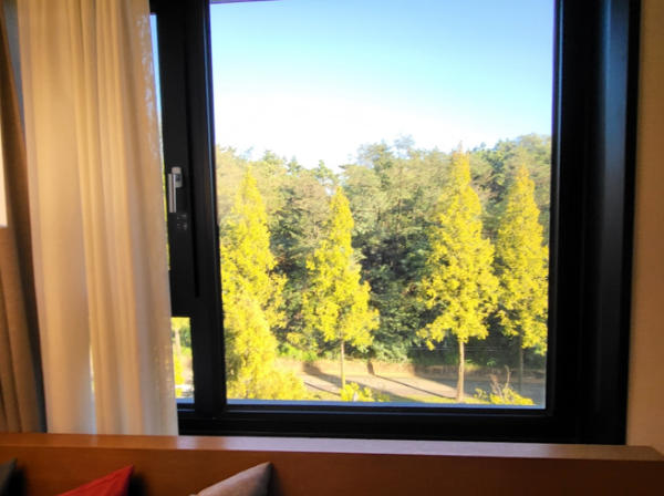 쇼파 뒤 커튼을 열어보면 라마다호텔의 뷰입니다. 다음날 일어나서 찍은 사진인데요. 도로 앞 나무가 울창하게 있고 그 뒤로는 은파호수공원이 있습니다. 밤에 야경이 멋있다고 택시 기사님께서 알려주셨는데 아쉽게 가보지는 못했네요.