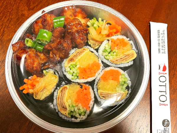 신선한 채소 재료의 오토김밥과 닭강정을 같이 먹으니 조화가 잘 이루어지는 듯 아닌 듯 하지만 먹기는 괜찮았습니다. 다만 9,500원의 가격에 적은 양이 다소 아쉬웠습니다.