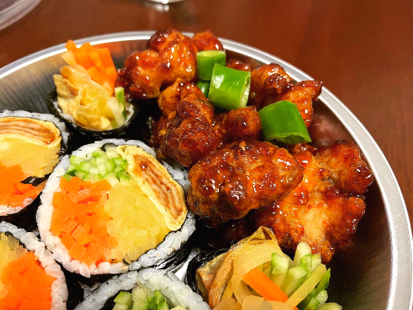 속 재료로 꽉 찬 김밥과 달달한 양념이 꾸덕하게 묻어있는 닭강정이 맛있어 보입니다.