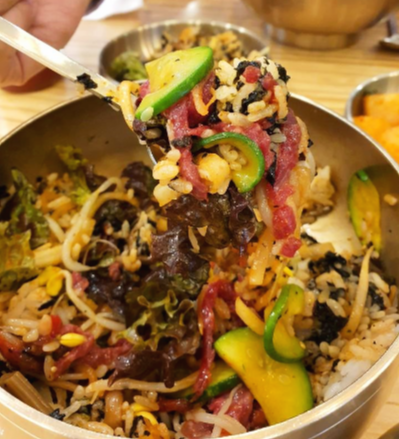 육회비빔밥입니다. 계란, 육회, 무채, 호박, 고사리, 상추 그리고 김가루가 들어있습니다. 김가루 들어간 육회비빔밥은 저는 처음 본 것 같습니다.