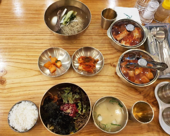 곰탕을 먹으러 들어왔는데 평양냉면을 보니까 어떤 맛일지 궁금했습니다. 을밀대, 정인면옥, 평양면옥, 우레옥 다른 평양냉면을 먹었기에 언주옥도 한번 먹어봐야 했습니다. 그래서 평양냉면(물)과 같이 간 친구는 밥으로 육회비빔밥을 주문하였습니다.