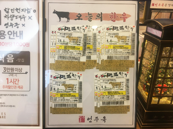 계산하고 나오는 카운터 옆에는 한우 이력이 나와있었습니다. 요즘 이력도 속이는 곳이 많다고 하지만 이렇게 오픈해 놓는 걸 보면 손님들에게 믿음을 주고 싶은 마음인 것 같습니다.