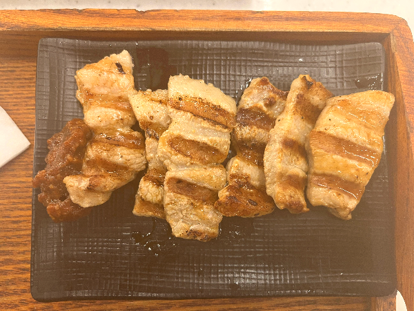 삼겹살구이입니다. 고기가 석쇠에 눌린 자국이 과자 베이컨칩을 떠올리게 합니다.