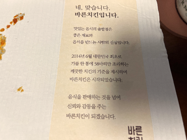 박스를 열어보니 안쪽으로 바른치킨에 대한 문구가 있었습니다. 바른치킨이 2014년 6월에 시작되었다고 하는데 저는 이제야 처음 먹어봅니다. 기름 한 통에 58마리만 조리하는 깨끗한 치킨의 기준을 제시한 바른치킨인데요. 58마리를 보고 60계치킨이 생각났습니다. 60계치킨의 60마리보다 2마리 줄인 것 같이 보여서 재미있었습니다.