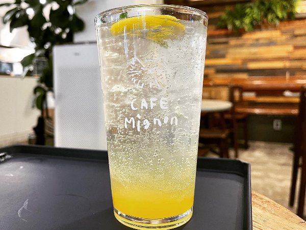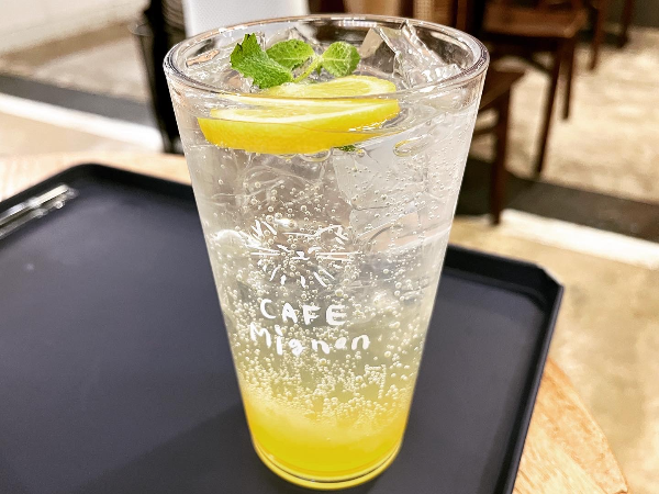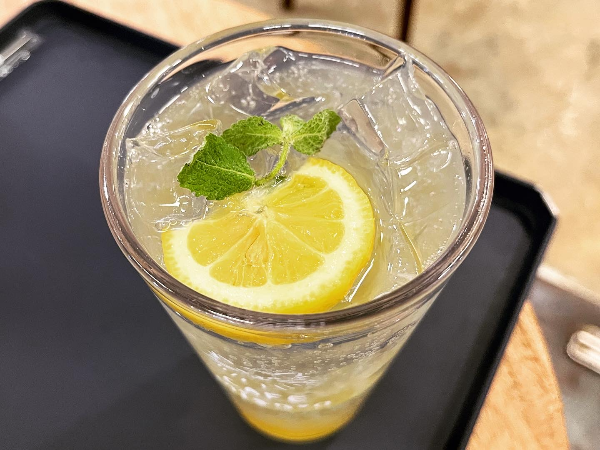 주문한 음료 레몬에이드가 나왔습니다. 시원한 투명 잔에 공기방울이 굉장히 청량해 보여서 좋았습니다.