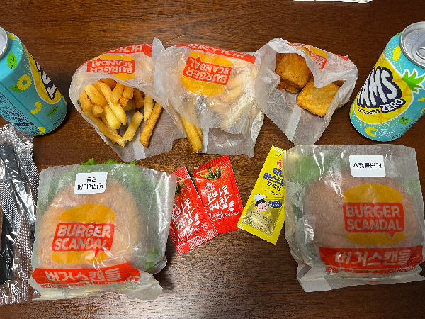 골든베이컨버거세트와 스캔들버거세트입니다. 반투명 포장지에 보이는 음식이 눈으로도 식욕을 불러왔습니다.