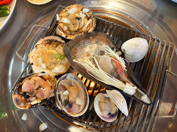일단 불판에 종류별로 다 올려보았습니다. 조개들이 큼지막해서 몇개만 올려도 불판이 꽉찼습니다.