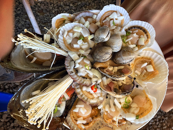 조개모듬(중)이 나왔습니다. 키조개, 가리비, 백합 등등 이름을 잘 모르는 조개들이 같이 있습니다.