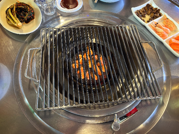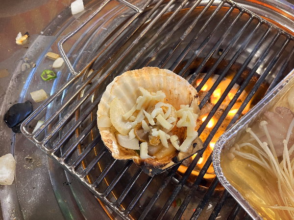 연탄불에 조개가 구워지면서 조개에서 물이 나와 끓기 시작합니다. 조개껍데기는 타면서 조개에서 나온 물은 점점 말라가는데요. 언제 먹는건지 다 익은건지 잘 몰랐습니다.