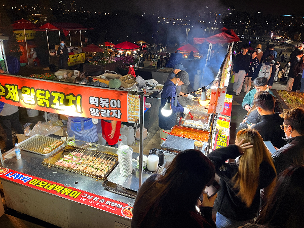 5호선 여의나루역 2번출구에서 여의도 한강공원으로 내려가는 계단 앞 수제 왕닭꼬치입니다. 여의도 밤도깨비야시장이 끝난 후에 이곳으로 자연스럽게 걸어오게 되었는데요. 밤도깨비야시장에서 못 먹은 닭꼬치를 먹고 싶어서 오게 되었습니다.