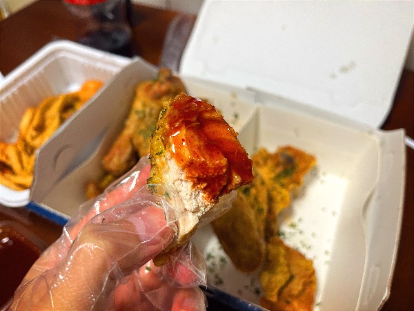 묽은 양념 소스도 발라서 먹어보았습니다. 양념을 찍었을 때 묽어서 금방 흘러내렸습니다. 양념에서 고춧가루 맛이 강하게 나고 단맛은 조금 늦게 났습니다. 계속 먹다 보니 떡꼬치 소스 맛 같기도 하고 그랬습니다. 처음 먹었을 때는 치킨과 안 어울리는 것 같았는데 먹다 보니 금방 적응되는 맛이었습니다.