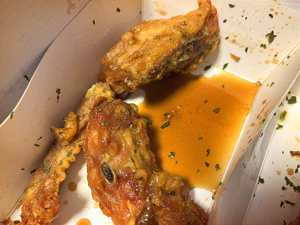 바닥에 양념 소스가 흘러 있었습니다. 바닥에 있는 소스를 조금씩 찍어서 먹어보았습니다. 이제서야 간장의 짭조름하고 달달한 맛이 느껴져서 맛있었습니다. 간장치킨으로 유명한 브랜드의 교X치킨보다 훨씬 더 맛있게 느껴졌습니다.