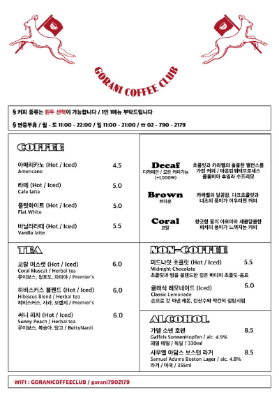 고라니커피클럽 메뉴입니다. 일반 카페에 비해서 단출합니다. 단출한 메뉴에도 커피 종류에는 원두 선택도 가능합니다. 저는 커피를 안 마셔서 항상 레모네이드를 먹고 있는데요. 이곳에서는 분위기 때문인지 레모네이드보다 미드나잇 초콜릿이 먹고 싶었습니다. 아내 분은 아이스 바닐라라떼 저는 미드나잇 초콜릿 따뜻한 걸로 주문하였습니다.