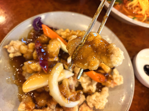 탕수육입니다. 배달 탕수육과 달리 부먹으로 나옵니다. 저는 부먹파라서 괜찮았는데 아내 분은 찍먹파라 조금 당황했습니다. 아내 분은 소스가 묻어 있지 않은 쪽으로 먹기 시작하였습니다.