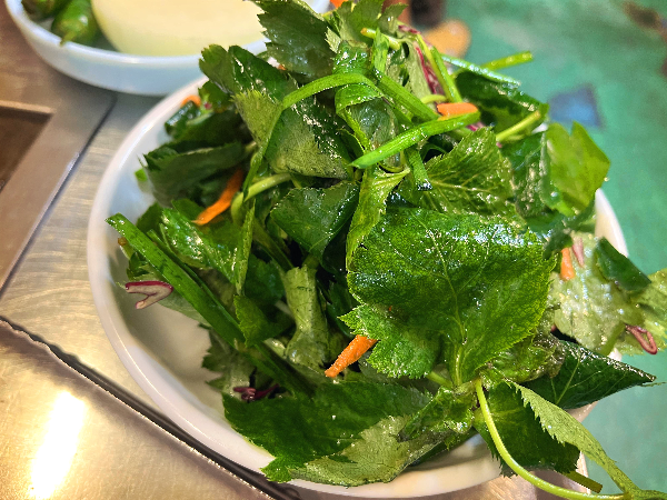 또 맛있는 이유로 이 나물에 있습니다. 정확하게는 모르지만 참나물 같은데요. 달콤 쌉싸름한 나물에 고기를 같이 먹으면 고기의 기름기가 싹 없어지는 기분입니다.