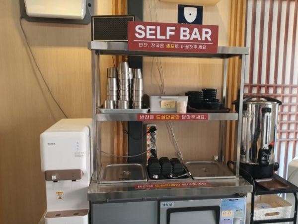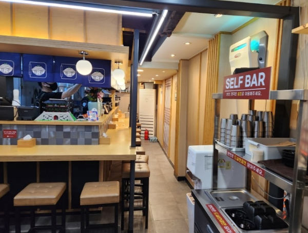 셀프바에서 반찬 두가지 김치와 단무지를 덜고 뜨끈한 국물도 가져옵니다.