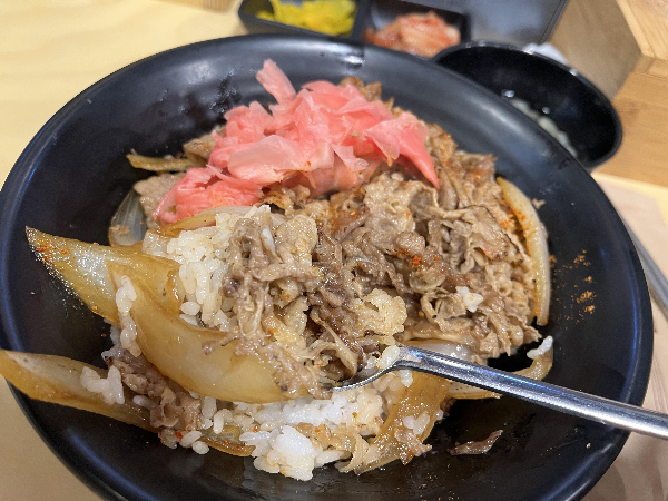 생강 없이도 맛있었지만 생강도 한번 같이 먹어보기로 하였습니다. 생각보다 생강의 향이 강하게 느껴지지 않았습니다. 고기의 단맛과 의외로 잘 어울렸고 생강 없이 먹으면 조금 물리는 단맛의 소고기가 생강 때문에 소고기의 단맛을 적당하게 중화시켜서 더욱 맛있게 느껴졌습니다. 생강이 규동의 맛에 한수인 것 같았습니다.