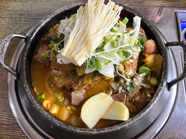 위에서 봤을때는 잘 안 보이는데요. 옆에서 보면 감자탕 뼈 위로 쌓아 올려주셨습니다. 감자탕(소)이라서 그런건지 냄비가 조금 작은 느낌이 들었고 뼈가 꽉 차고 국물이 너무 적은 느낌이었습니다.