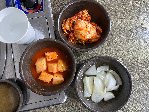 밑반찬이 나왔습니다. 기본 반찬인 김치와 깍두기 그리고 양파절임 같습니다.