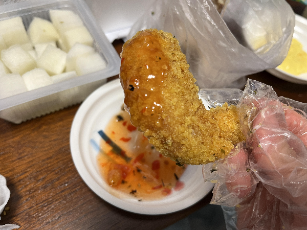 아내 분은 칠리소스와도 어울릴 것 같다며 냉장고에 있던 칠리소스를 꺼내서 먹어보았습니다. 생각보다 잘 어울리고 맛있었습니다. 사실 칠리소스는 어떤 음식에도 무난하게 잘 어울리는 맛이기는 합니다.