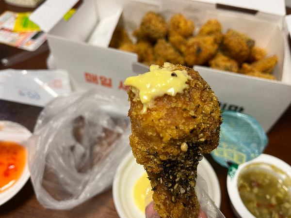 크런치한 느낌의 크크크치킨 다리를 먼저 집었습니다. 아내 분이...