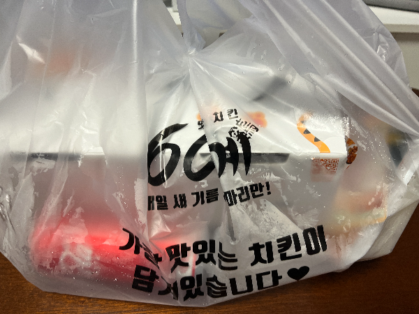 매일 새 기름 60마리만! 튀기는 60계치킨입니다. 카카오뱅크 26주적금 이벤트로 교촌치킨 1만포인트를 받아서 교촌치킨을 먹으려다가 1만포인트의 조건 때문에 아내 분이 먹고 싶어했던 60계치킨의 신메뉴 크크크치킨으로 변경하였습니다. 날씨가 추워서 그런지 봉투에 습기가 차서 왔습니다. 배달하시는 분들 고생 많으십니다.