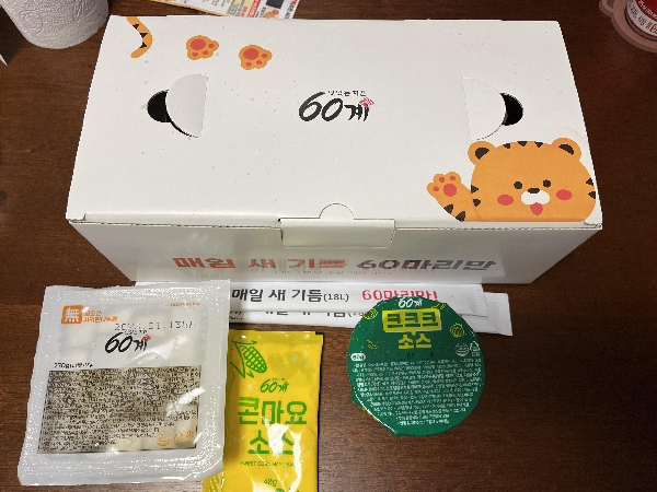 집 근처에 신풍역점과 신대방삼거리역점 두군데가 있었는데요. 배달료가 천원 더 싼 신대방삼거리점으로 주문하였습니다. 60계치킨 박스에 귀여운 호돌이가 손을 흔들어주고 있네요. 어흥~~