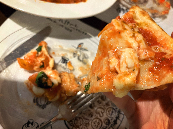 한 조각 들고 손으로 먹는 걸 좋아하는데 토핑이 자꾸 쓸려내려가서 잡을 수가 없었습니다. 거뭇하게 그을린 도우는 바삭하고 쫄깃해서 맛있었지만 토핑이 올려진 부분은 맛과 식감 모두 아쉬웠습니다.