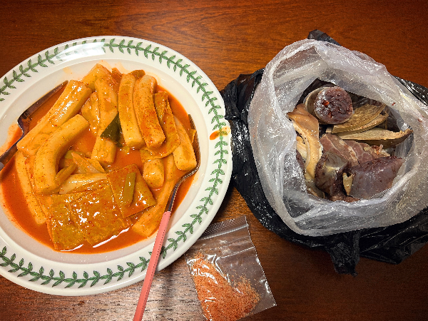 포장해 온 떡볶이와 순대입니다.
